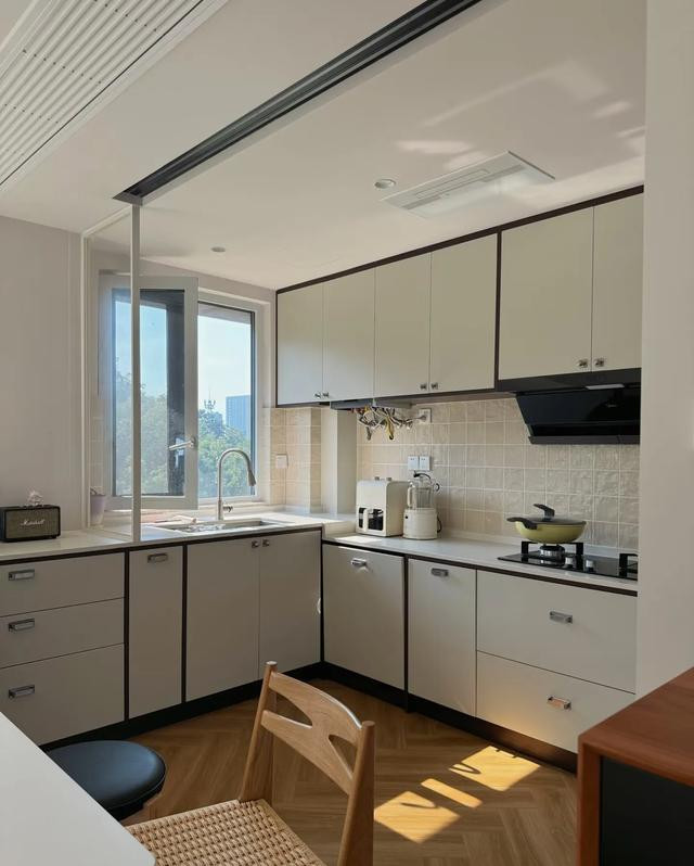 厨房区域属于开放式设计,橱柜l型布局,柜门白色,台面浅色石英石,台面高低台设计,使用起来很舒服啊!
